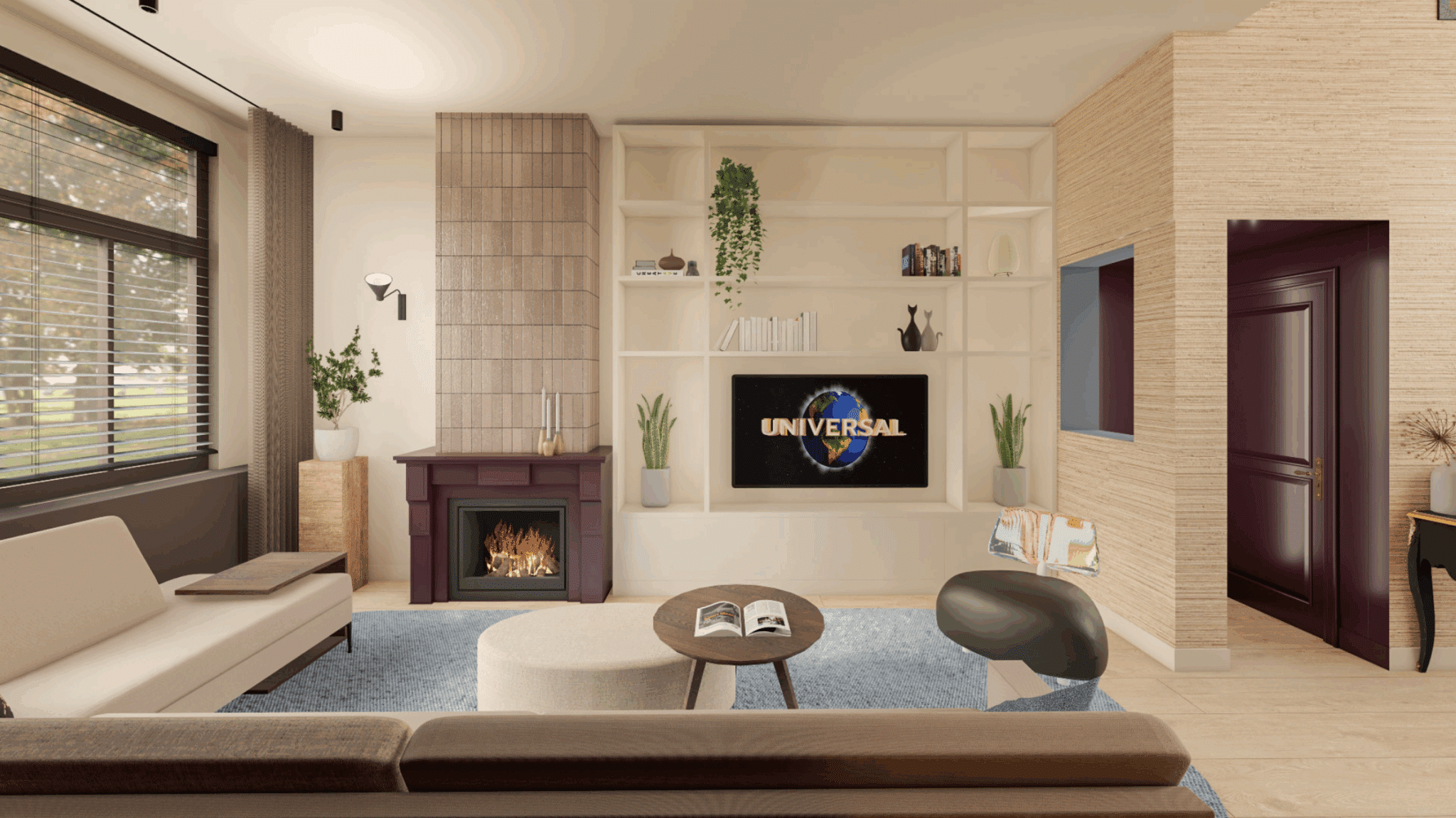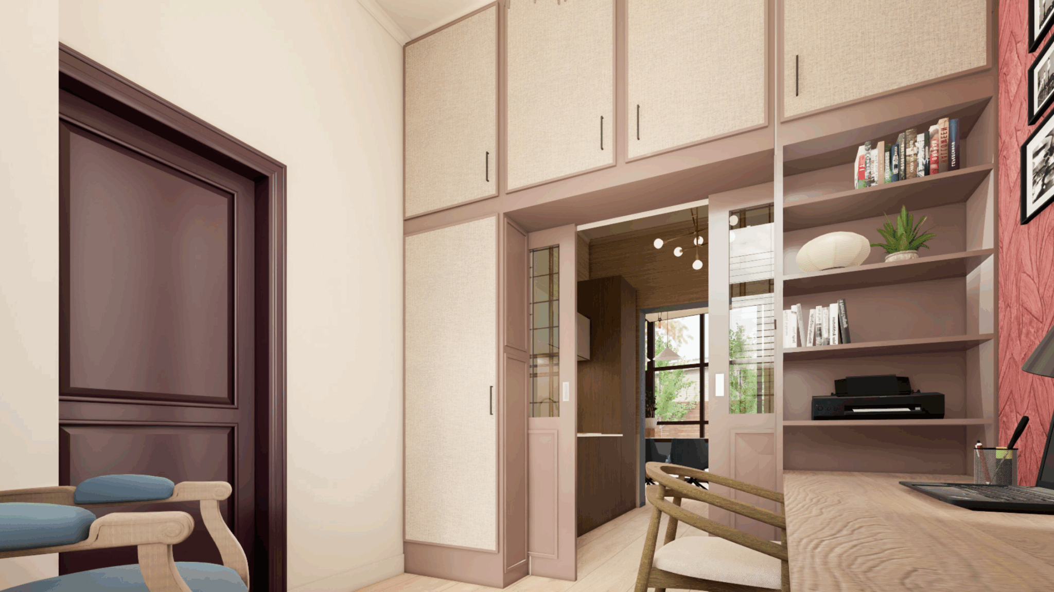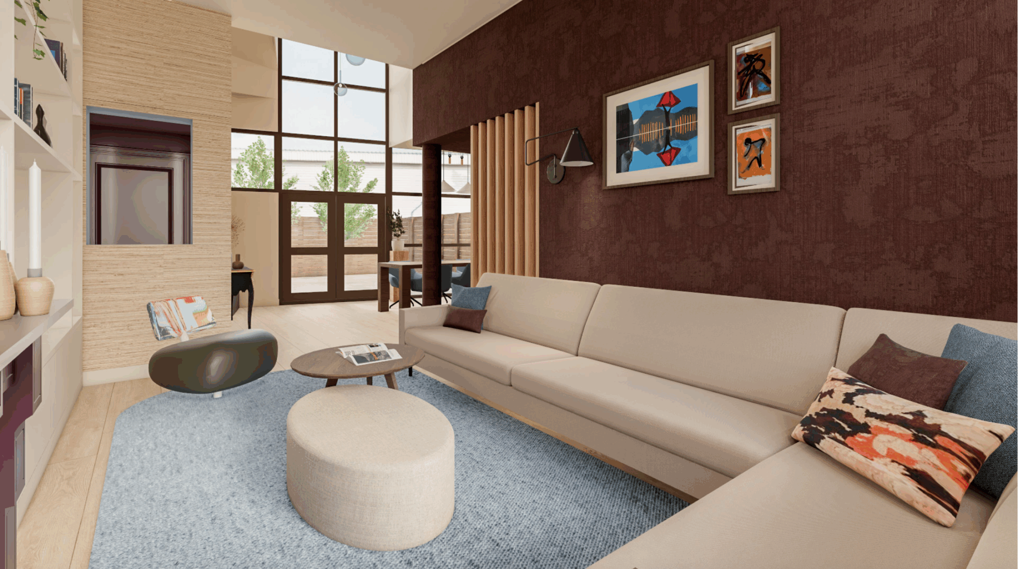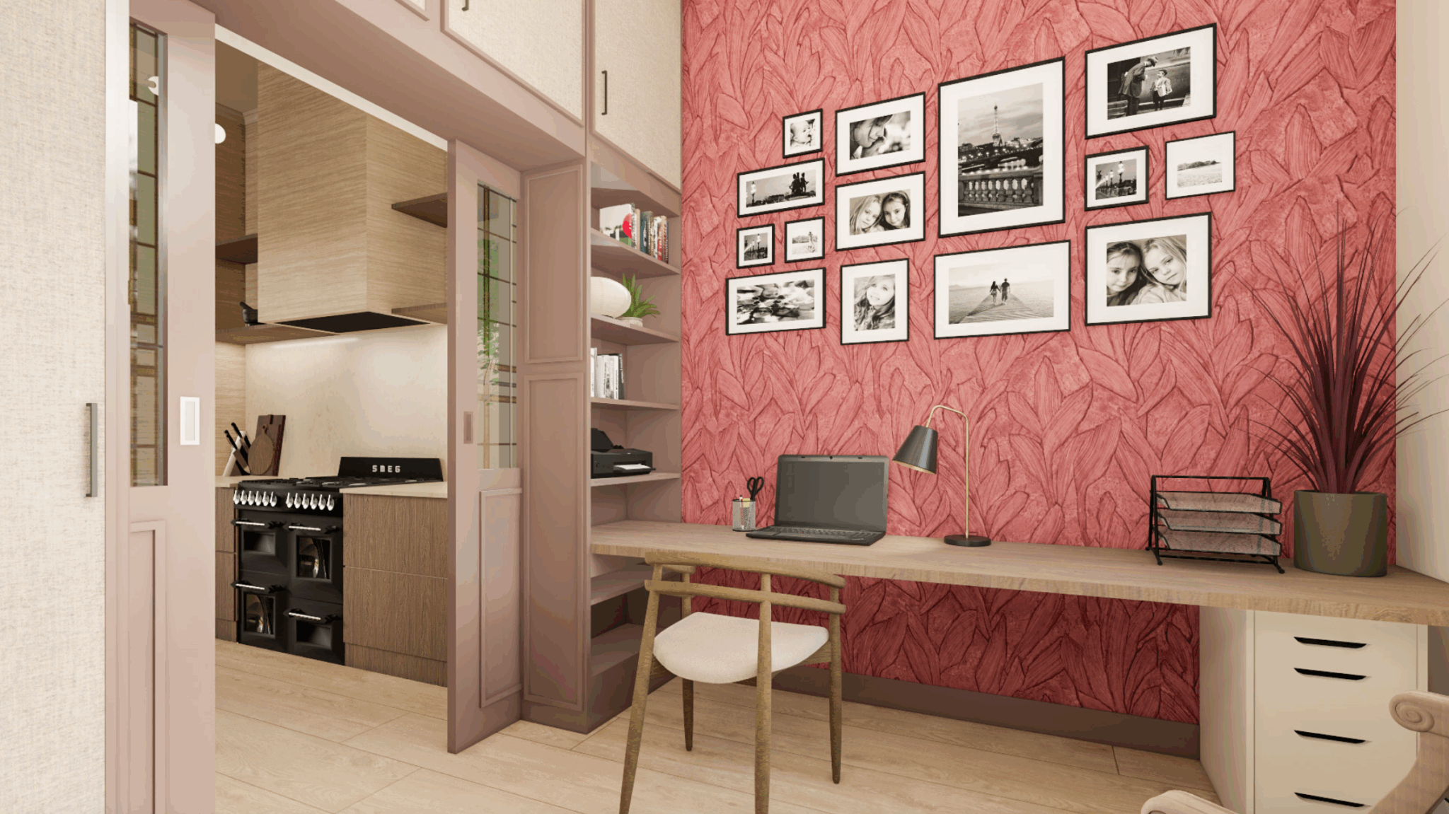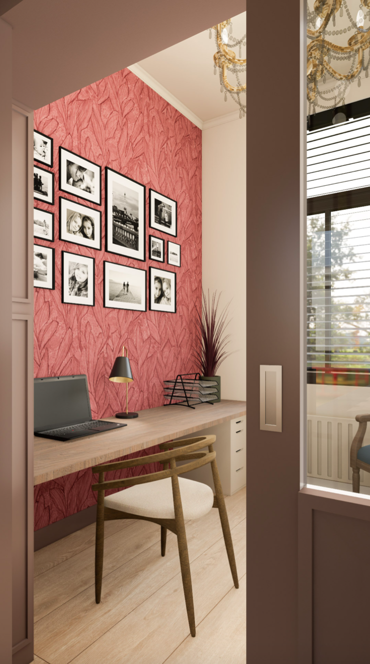 Een jaren 30 tussenwoning met hoge moderne uitbouw. Hoe maken we het hier gezellig zonder dat het oudbollig wordt maar ook niet te modern? Dat was de vraag die ik kreeg. Door gebruik te maken van warme kleuren en de diepe bestaande paarse kleur door te trekken in verschillende tinten ontstaat er rust. Maar voor wat extra diepte werd er gebruik gemaakt van het blauw uit het schilderij dat zo geliefd is.