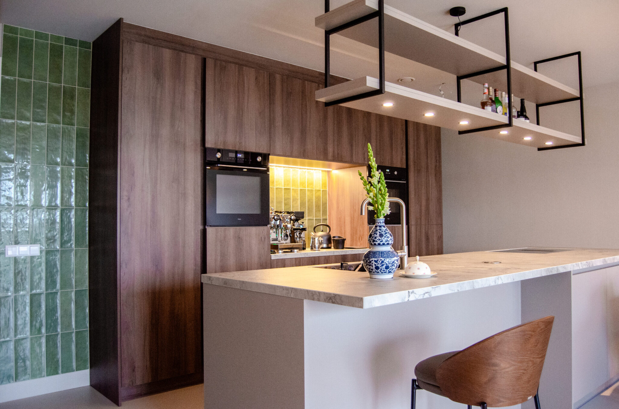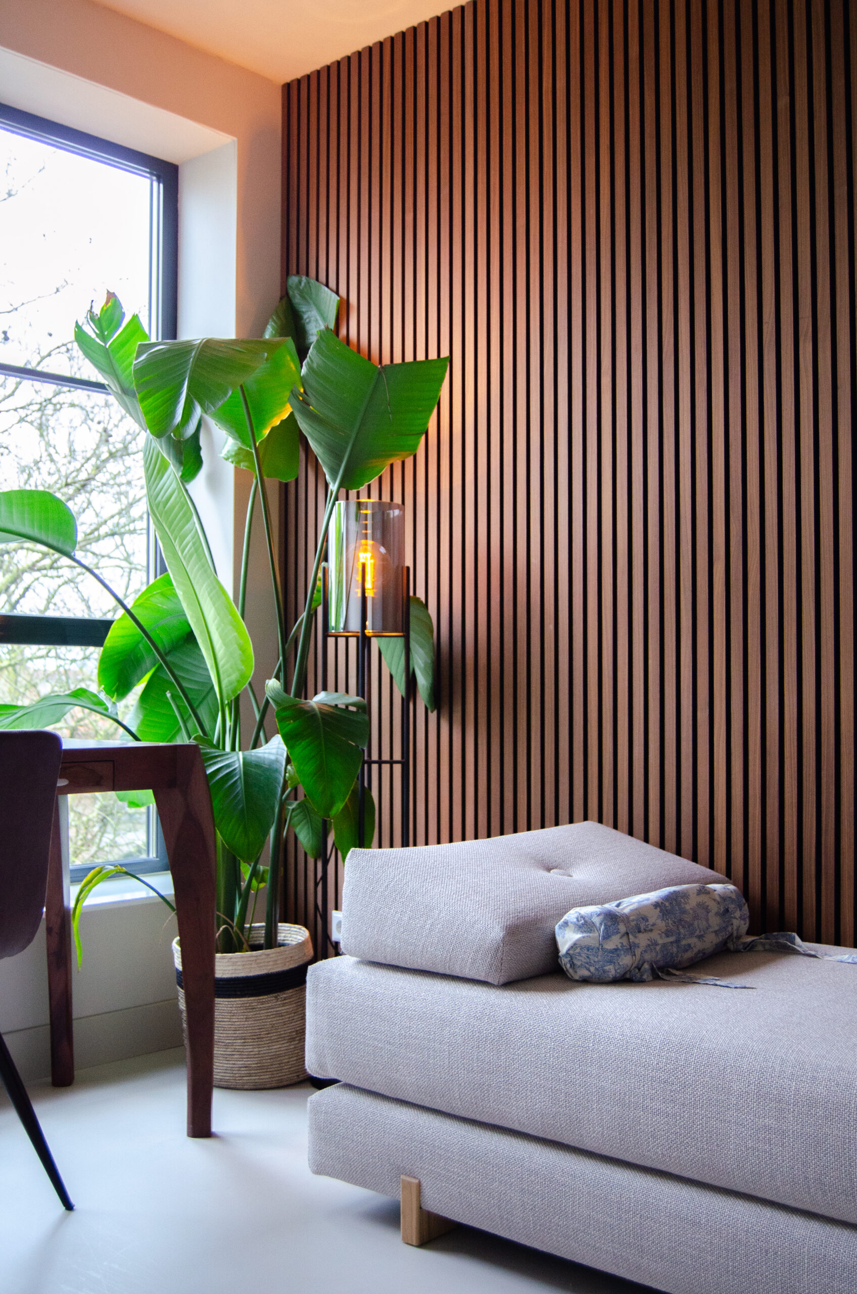 Nieuwbouw, grote ramen, kale wanden. En nu? Een luxe, moderne loft vibe moest het krijgen. De gietvloer was de juiste basis hiervoor. Voorlopig is nog niet al het behang geplakt, maar de wens is er nog om op de lange wand een goed statement te maken in de toekomst. Voor nu, zeg nou zelf alsof je een hotel in New York binnen stapt toch?